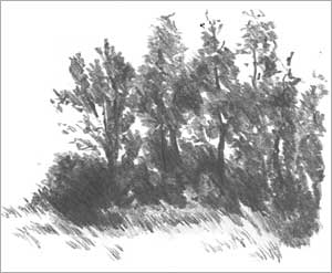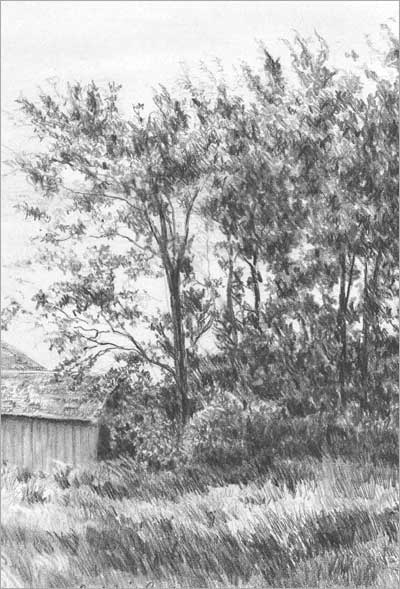L’erba trascurata crea fili belli lunghi. Ma anche in questo caso, suddividere e variare la lunghezza è importante. Il movimento delle masse erbose, creato tracciando archi e variando la direzione dei tratti di matita, suggerisce la sensazione di una giornata ventosa.