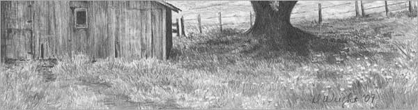 Nel disegno “Madrid Barn”, qui sotto a sinistra, è stata usata questa tecnica per rappresentare la crescita eccessiva di cespugli e alte erbacce, comune dell’Iowa.