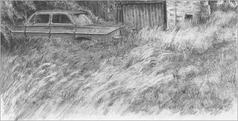 Con delle matite temperate con la punta a scalpello piatto 4H o 2H, è stato steso un tono leggero su alcune aree dell’erba, creando aree di erba uniformemente in penombra (Per esempio accanto all’auto) L’effetto cercato è quello di dare l’impressione di trovarsi in un cortile invaso da erbacce agitate dal vento – senza che la rappresentazione di ogni singolo filo d’erba disturbasse la composizione.