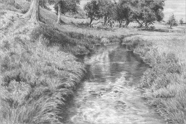 Dell’erba in distanza potrebbe essere resa anche solo con una stesura tonale. Anche l’erba alla base dell’albero in primo piano del disegno qui sotto può essere resa con poco più che una trama. Fino a che non si arriva a rappresentare la zona in primo piano, è difficile che serva distinguere i singoli fili d’erba.
