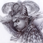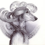 Giocando col chiaroscuro ho iniziato ad arricchire l’immagine inserendo le trecce tra i capelli, curando la ricchezza dei tessuti, la piuma, i gioielli, più come sfida tecnica che in base ad un’idea precisa. Da un colletto tutto grigio puoi ottenere un broccato, da una macchia della penna un orecchino, da un segno impossibile da coprire, una parte di colletto che si arrotola verso l’alto. Un gioco un po’ tecnico e un po’ creativo, mi sono divertita.